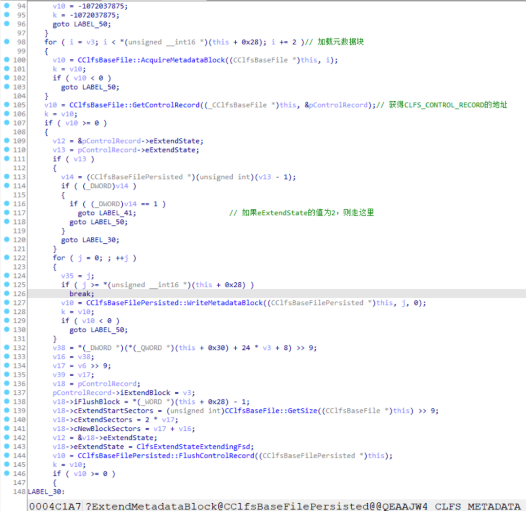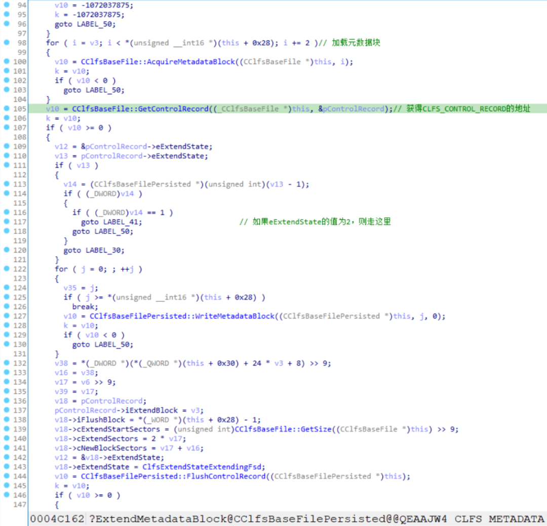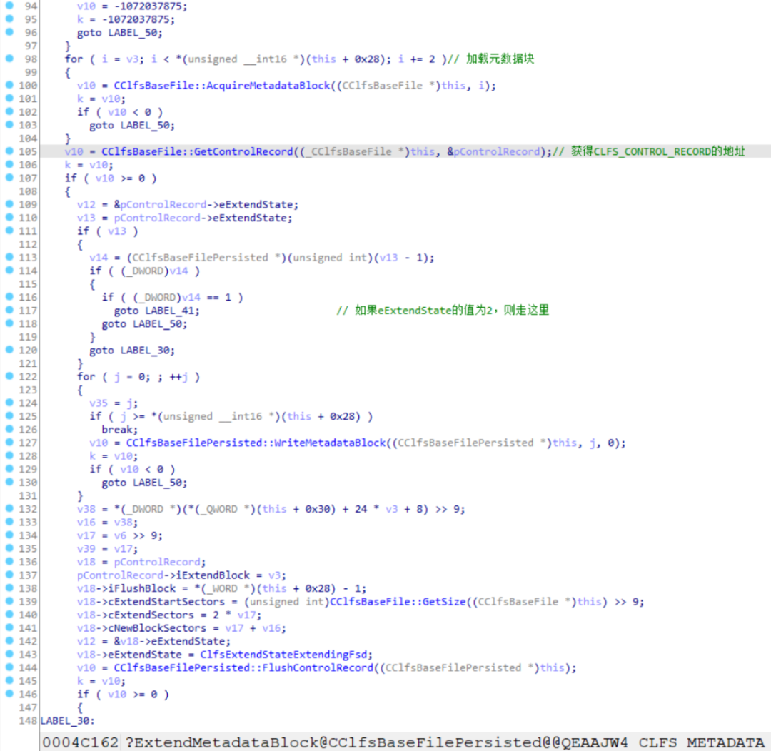ExtendMetadataBlock函数98行根据参数2(iExtendBlock)加载元数据块,然后获取控制记录指针。当控制记录的eExtendState成员值为2时,跳转到LABEL_41。