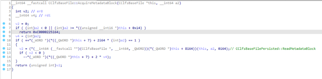 AcquireMetadataBlock中调用了一个虚函数,在windbg中跟踪为CClfsBaseFilePersisted::ReadMetadataBlock函数。