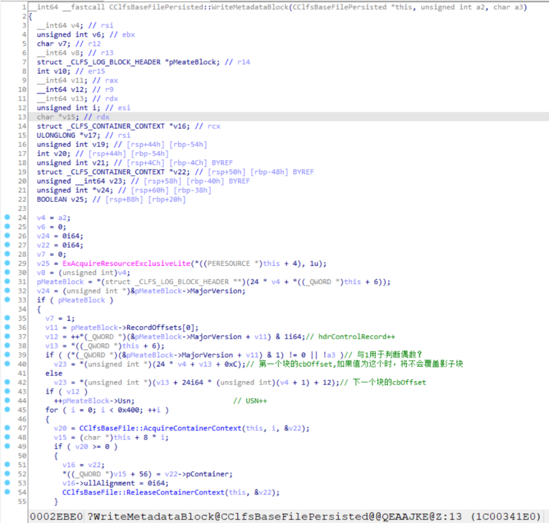跳转到LABEL_41后,在208行调用了CClfsBaseFilePersisted::WriteMetadataBlock函数。需要注意的是ClfsMetaBlockControlShadow块中的iFlushBlock值为0x13,即WriteMetadataBlock的参数2值为0x13。
