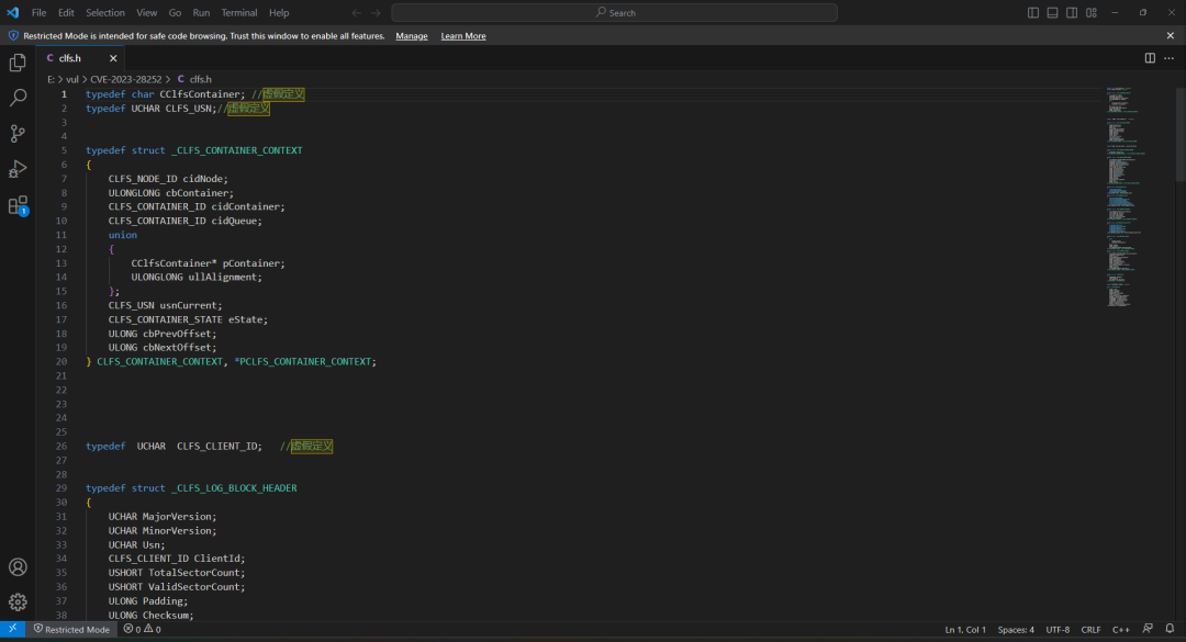 红雨滴团队的《CVE-2023-28252在野提权漏洞样本分析》文章详细的分析了恶意文件并定位到漏洞触发点,但由于文章的主要目的是分析恶意文件而非讲解漏洞成因,因此漏洞成因方面的内容偏少。该文的主要内容是分析clfs.sys内的函数,以了解漏洞触发过程。由于笔者刚入门,如果文章出现错误,请多多包涵。