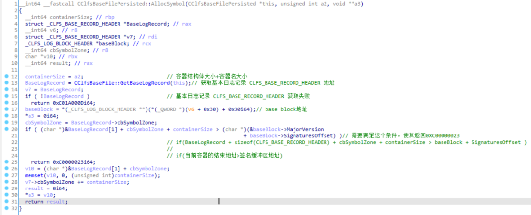 在AllocSymbol中的25行发现了错误码0xC0000023,其触发条件为当前容器的结束地址大于签名缓冲区地址。当前容器的结束地址根据_CLFS_BASE_RECORD_HEADER结构的cbSymbolZone成员值计算得到,因此可以修改cbSymbolZone值使其满足条件返回错误码0xC0000023,从而在AddSymbol中调用ExtendMetadataBlock函数。
