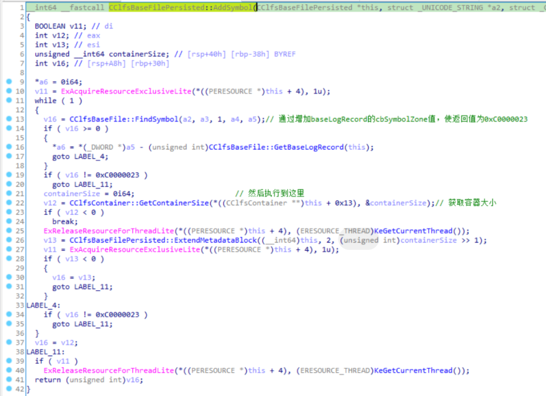 AddSymbol函数中当v16 值为 0xC0000023时,会在26行调用CClfsBaseFilePersisted::ExtendMetadataBlock函数。v16为CClfsBaseFile::FindSymbol函数的返回值,因此关注FindSymbol函数。