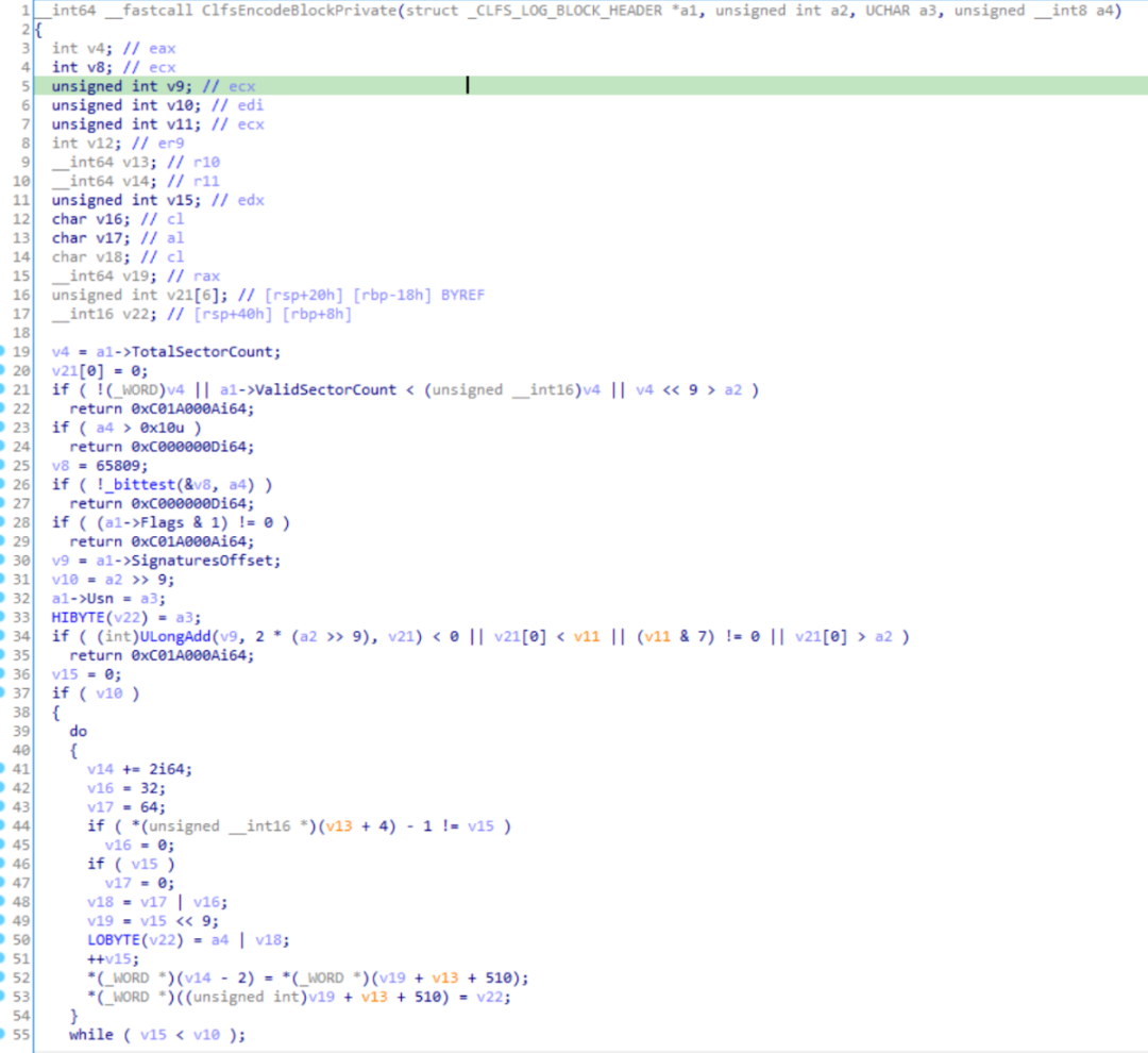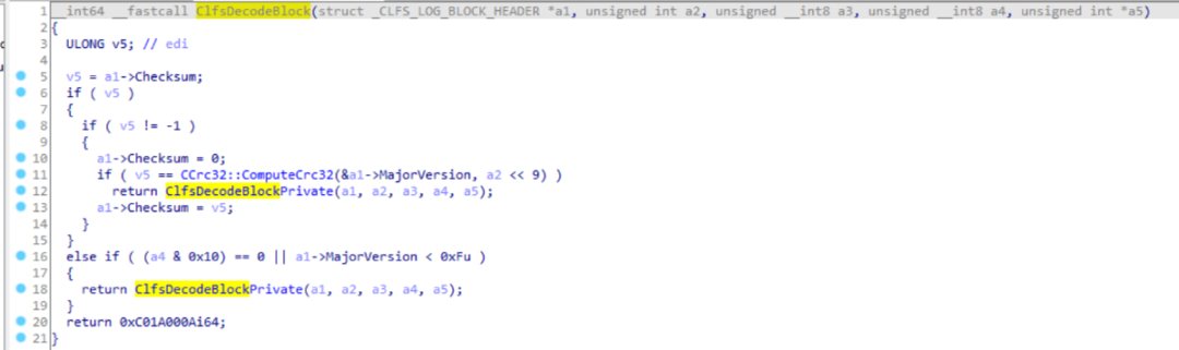 ClfsDecodeBlock函数先判断校验和是否为0,这里为0然后跳转到16行继续判断。通过ReadMetadataBlock的函数调用可知a4值为0x10,然后MajorVersion值为0xF,因此该检测失败,直接返回错误代码 0xC01A000A。至此ReadMetadataBlock函数使用ClfsMetaBlockControlShadow块替换了ClfsMetaBlockControl块。