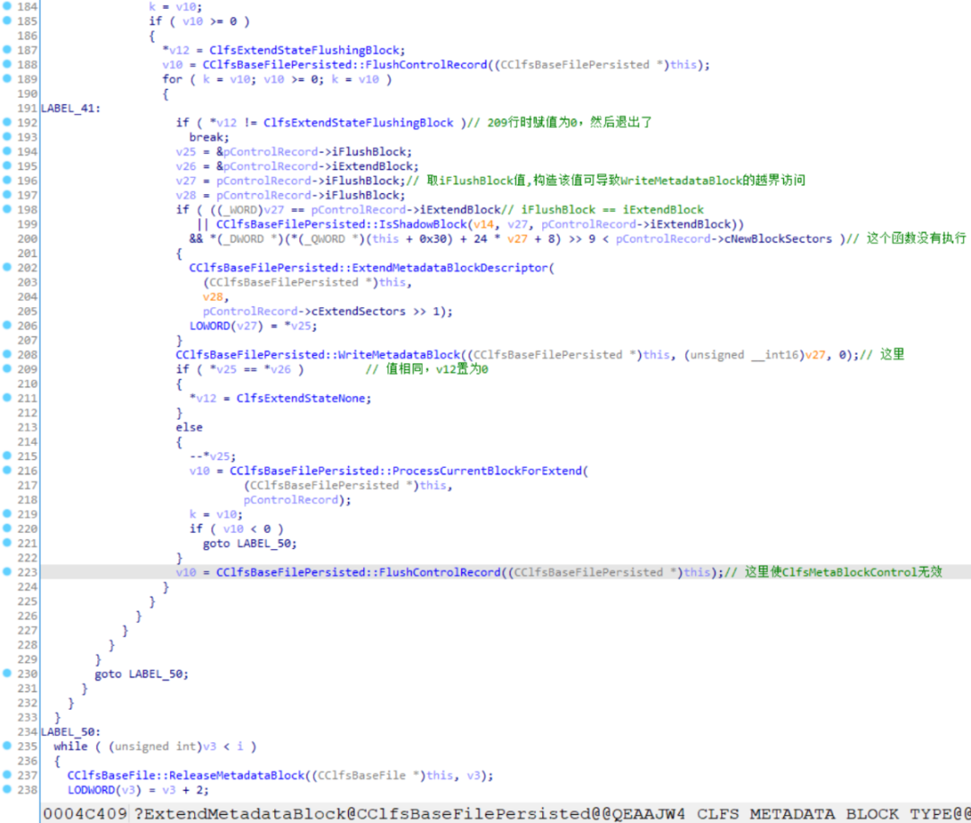 192行检测eExtendState值是否为2,不为2则退出循环。随后在208行使用iFlushBlock作为参数2调用CClfsBaseFilePersisted::WriteMetadataBlock函数(本次调用该函数时,参数2被指定为了4,用于扩展ClfsMetaBlockScratch块,这一过程只是为了过渡到FlushControlRecord函数的调用)。随后209行检测iFlushBlock与iExtendBlock值是否相同,相同则v12复制为0,从而在下次for循环时,从192行的检测中退出循环。循环最后调用了CClfsBaseFilePersisted::FlushControlRecord,这个函数需要重点关注。