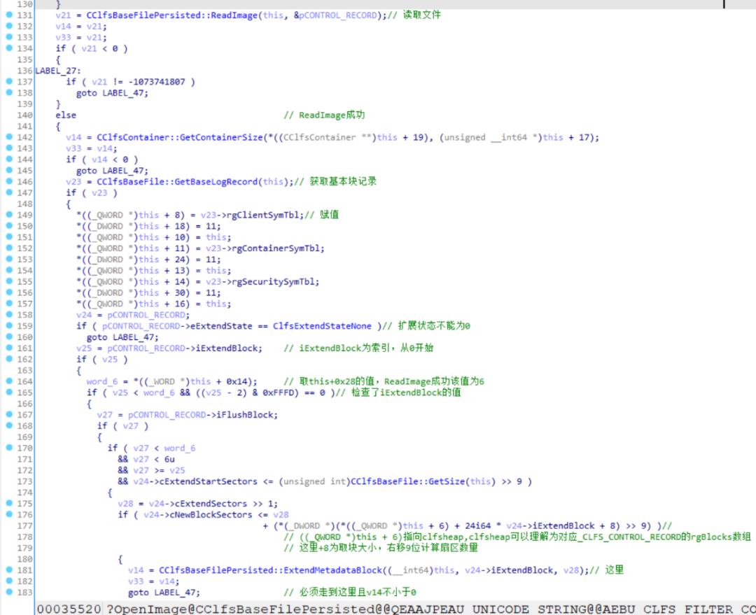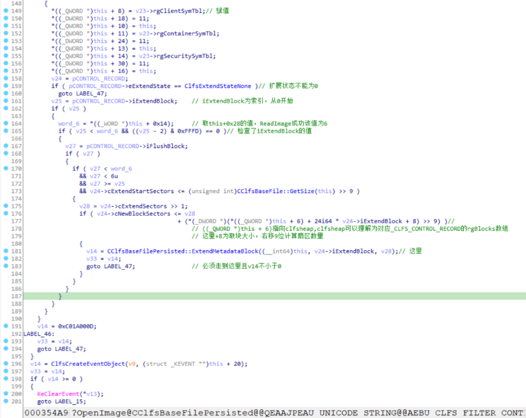 随后OpenImage函数的131行调用CClfsBaseFilePersisted::ReadImage函数加载日志文件,获取控制记录结构地址,加载成功后从142行代码开始执行。146行调用CClfsBaseFile::GetBaseLogRecord函数获取基本日志记录地址,该返回值为_CLFS_BASE_RECORD_HEADER指针,指向ClfsMetaBlockGeneral块的第二个结构体,随后在149-157行使用基本日志记录初始化数据。当控制记录的eExtendState不为0,iExtendBlock小于4,iFlushBlock小于6且大于等于iExtendBlock,cExtendStartSectors小于文件扇区总数量,cNewBlockSectors小于扩展元数据块的扇区总数量加上(iExtendBlock/2)时,将在179行调用CClfsBaseFilePersisted::ExtendMetadataBlock函数。