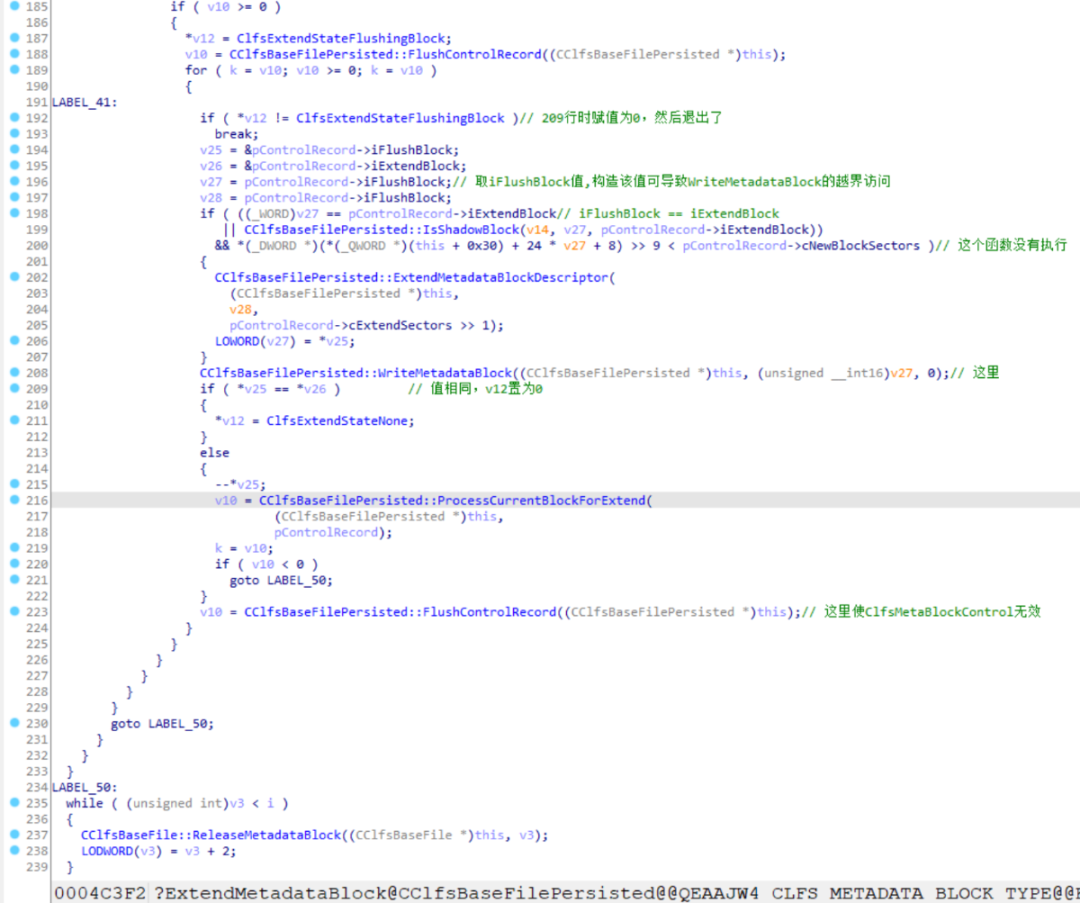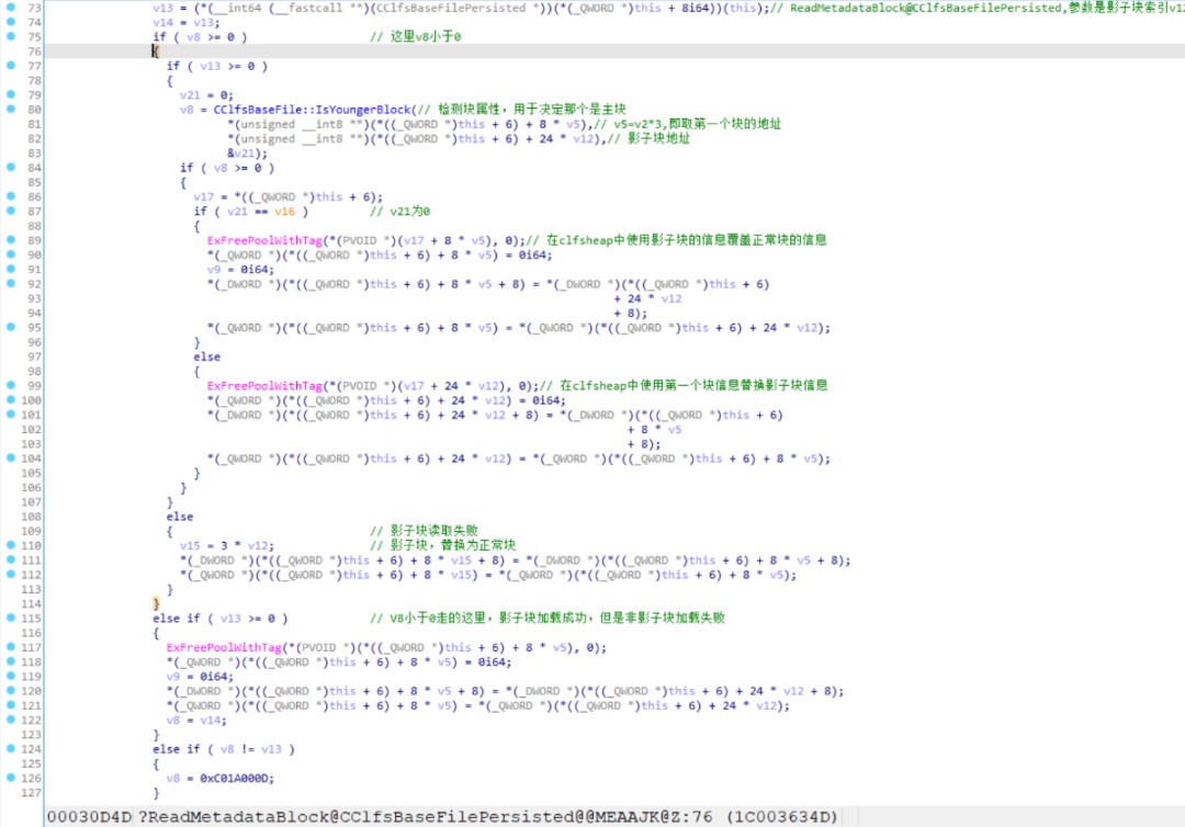 回到ExtendMetadataBlock函数,可以得知105行代码获取的实际为ClfsMetaBlockControlShadow块。随后通过检测,跳转到LABEL_41处。