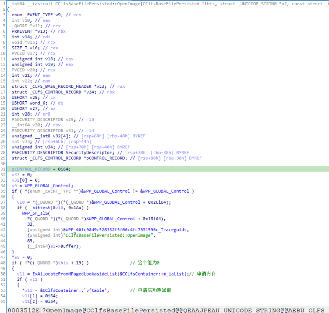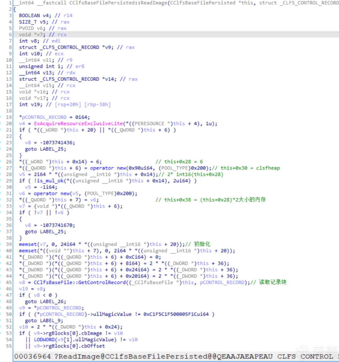 OpenImage中调用了CClfsBaseFilePersisted::ReadImage函数,这里提前说明下函数做了哪些后续要关注的工作。26行将this+0x28赋值为6,27行为this+0x30 申请内存空间,45行调用CClfsBaseFile::GetControlRecord获取控制记录的地址。控制记录为_CLFS_CONTROL_RECORD结构,为ClfsMetaBlockControl块的第二个结构体。