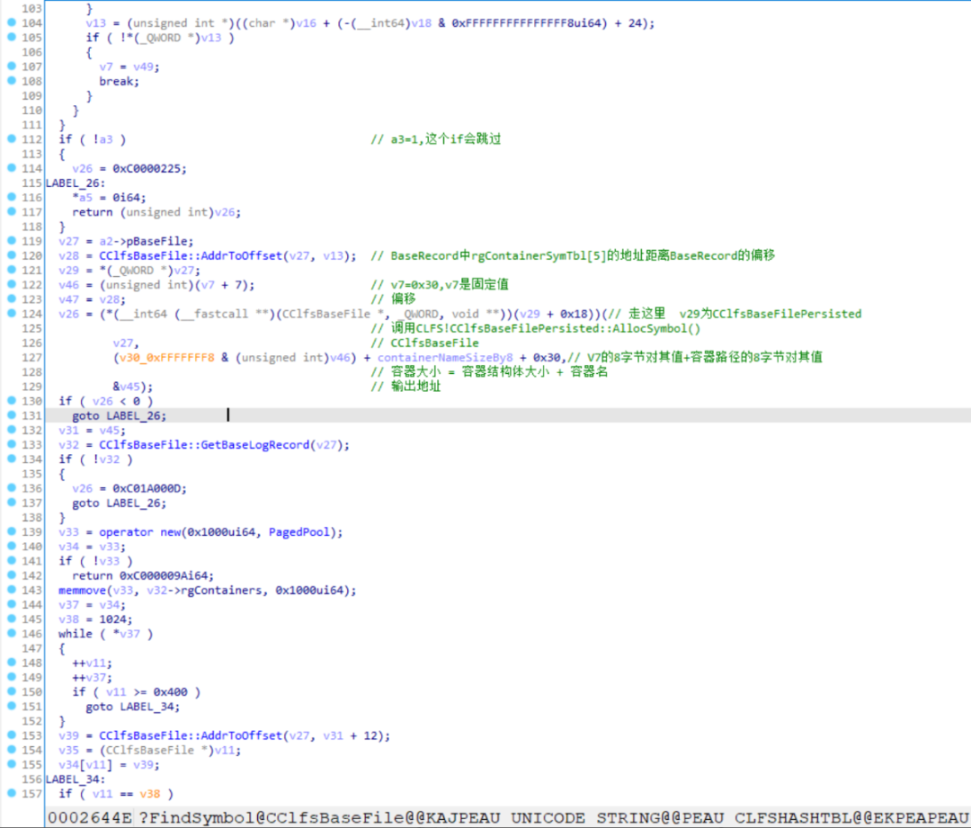 FindSymbol函数中没有发现0xC0000023错误码,但124行调用了虚函数,并且返回值为负数时将通过LABEL_26标记返回。使用windbg设置断点调试,最终确定该虚函数为CLFS!CClfsBaseFilePersisted::AllocSymbol()。