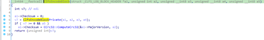 ClfsEncodeBlock先将_CLFS_LOG_BLOCK_HEADER的Checksum 成员值置为0,然后调用ClfsEncodeBlockPrivate函数进行下一步处理。当ClfsEncodeBlockPrivate返回结果为负数时,则不会重新计算校验和并返回。