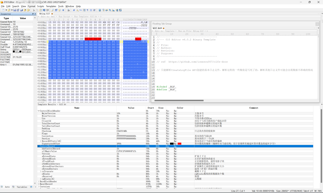 之前在CVE-2022-24521漏洞复现过程中,简单编写了一个010 Editor的模板,可以简单解析日志文件(.blf格式文件),便于了解文件结构布局,后续可在附件中下载。