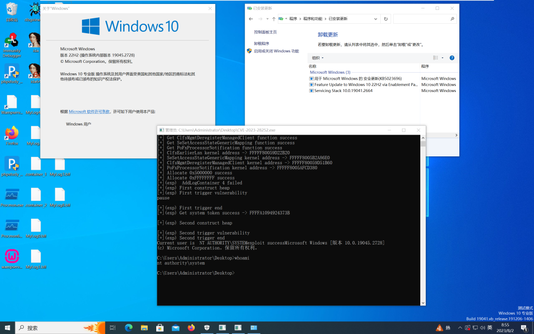 10.调用CreateLogFile函数再次加载日志文件A,随后通过CheckSecureAccess函数利用构造的容器,然后根据函数执行内存布局利用管道属性,实现任意数据写入,然后替换了进程的TOKEN从而实现提权。
