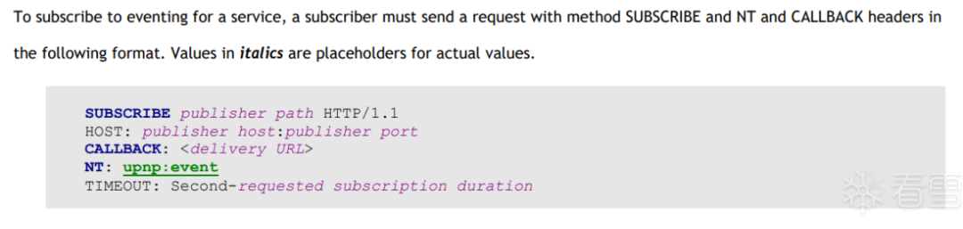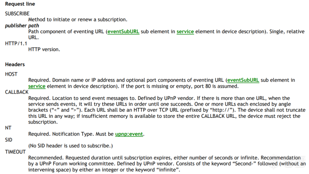 此漏洞涉及到的是UPnP的GENA(通用事件通知结构)相关内容,当设备服务状态发生变化时,会通过event通知控制点。控制点能收到通知的前提是要先订阅(SUBSCRIBE)该服务的指定event。订阅特定服务的事件的方法是:发送订阅消息到该服务的事件 URL。通过分析可知,此漏洞的触发条件是要路由器发送UPnP订阅服务的请求。根据UPnP官方文档可知订阅请求格式如下: