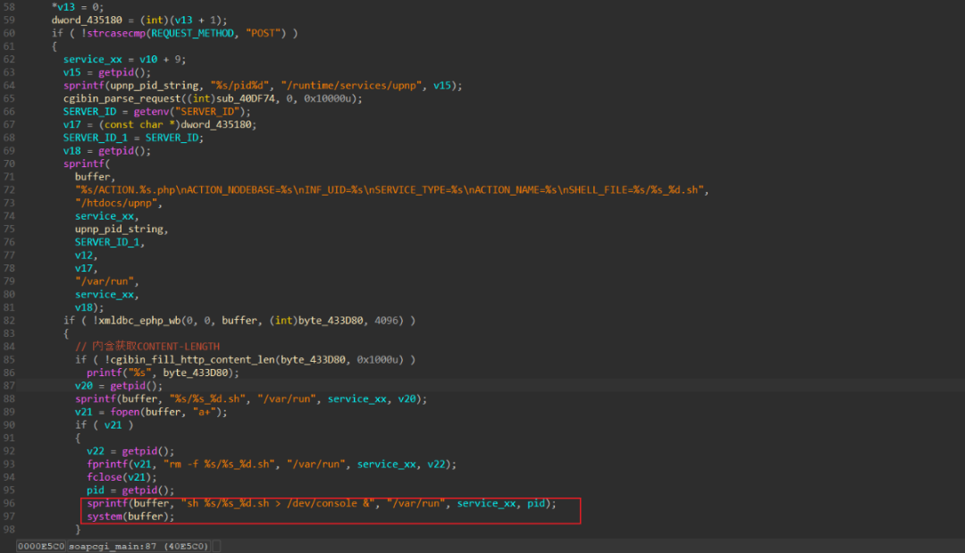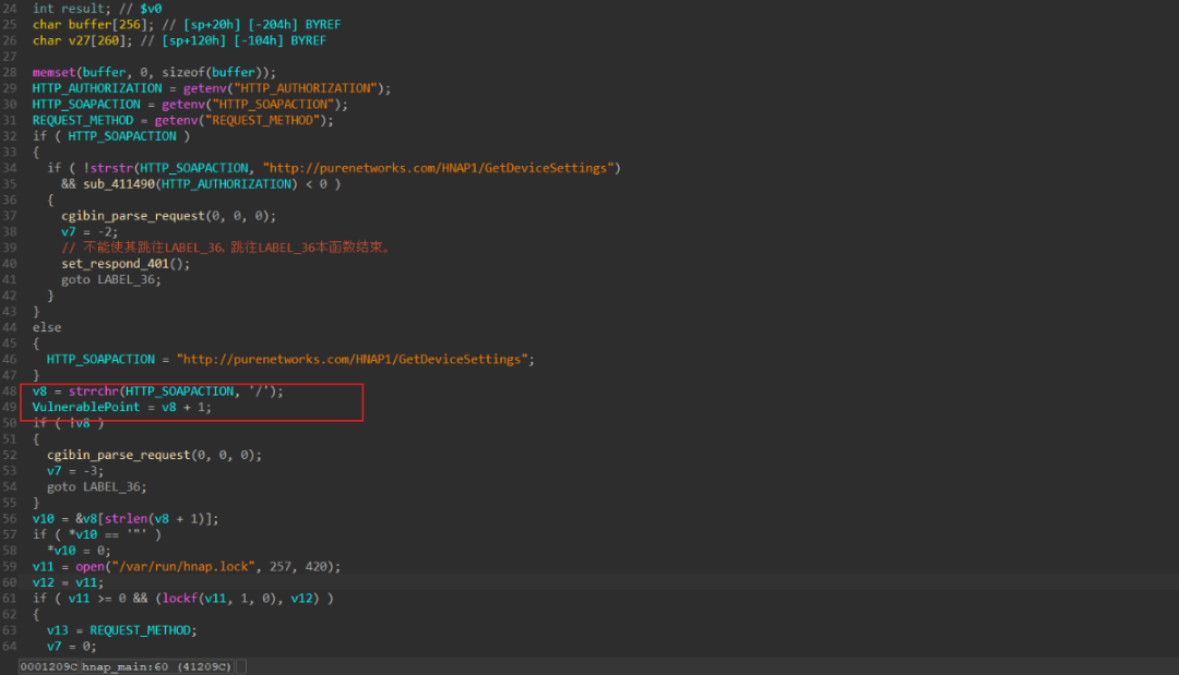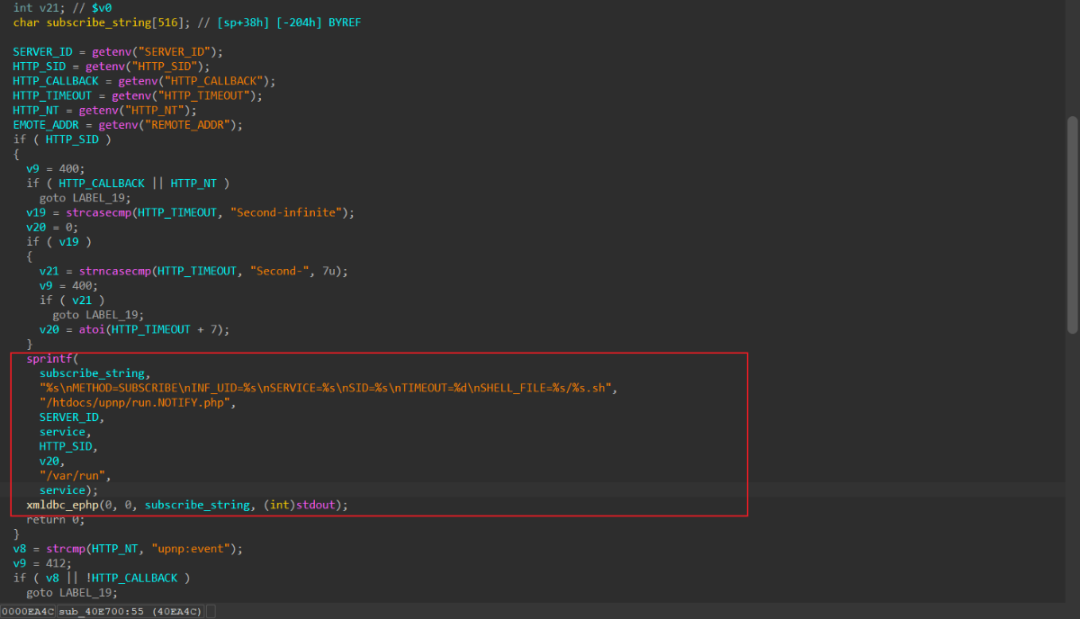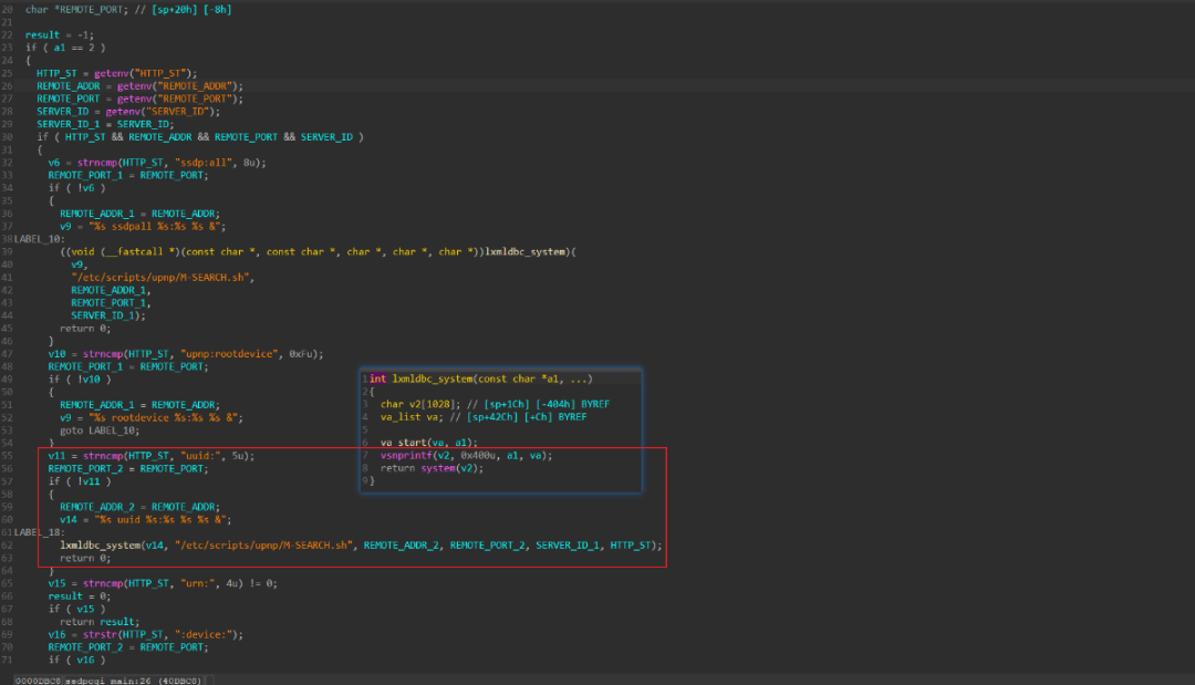 根据前面分析的漏洞可知,这次漏洞请求URL中的文件是ssdpcgi。ssdpcgi_main函数中漏洞点关键代码如下: