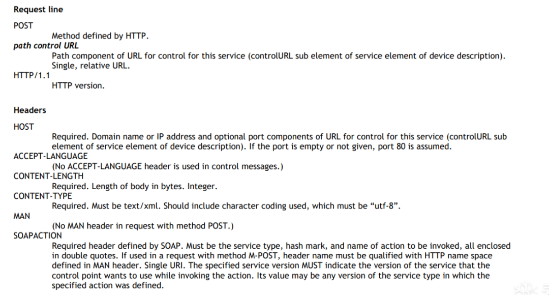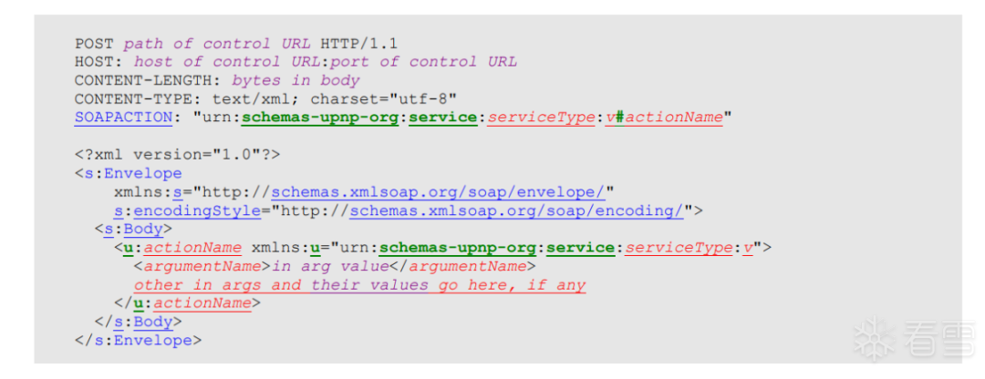 此漏洞涉及到的是UPnP的SOAP(简单对象访问协议)相关内容,SOAP主要是用于保证UPnP设备具有互操作能力。控制点可以调用UPnP设备上的服务,并接收返回结果。根据UPnP官方文档,要调用UPnP设备上的服务,控制点必须以POST方法发送以下格式的请求: