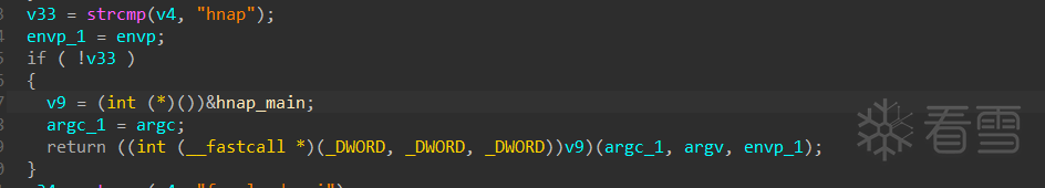 根据漏洞披露的信息可知和hnap_main函数以及cgibin文件有关,将cgibin文件拿到IDA中分析并直接搜索hnap_main函数,调用该函数的代码为: