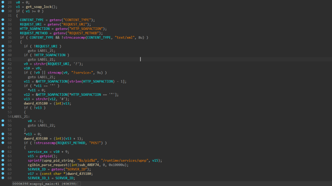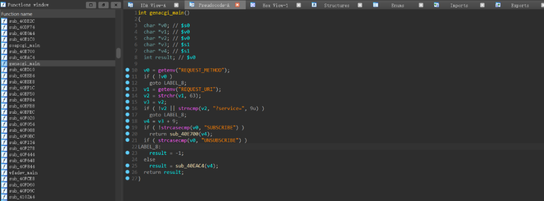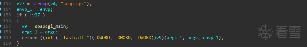 根据漏洞披露的信息可知漏洞点和 service 参数以及 soapcgi_main 有关,在文件系统中查找soapcgi_main并定位到所在文件cgibin,将其拿到IDA中逆向分析,通过函数名查找,定位到soapcgi_main函数,调用该函数的代码如下: