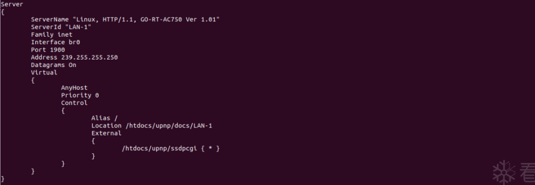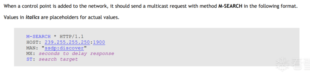 此漏洞涉及到的是UPnP的SSDP(简单服务发现协议)相关内容,该协议主要是用于发现网络中的UPnP设备。控制点(用户操作的HTTP客户端)可以通过使用简单服务发现协议,根据自己的需要在网络中查询能够提供特定服务的设备。相应的设备(也就是本路由器)向控制点发出回应,声明自己的存在及能提供的服务。该协议在HTTP之下使用的是UDP。控制点需要用以下格式发送请求: