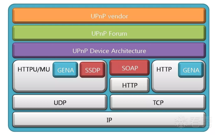 UPnP是由微软提出的一种通用即插即用技术,后续联合英特尔等多家科技公司共同制定了UPnP标准。UPnP主要是为了实现在“零配置”的前提下在联网设备间能自动连接和协同工作。UPnP的协议栈结构图如下: