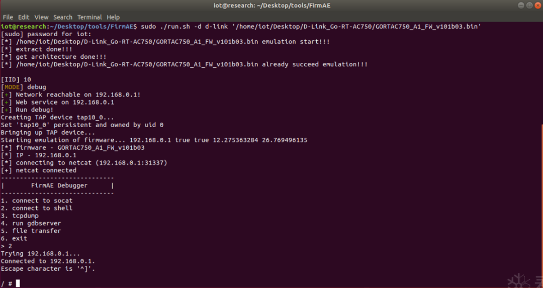 以调试方式模拟固件,以便分析过程中使用shell查看运行时相关信息: