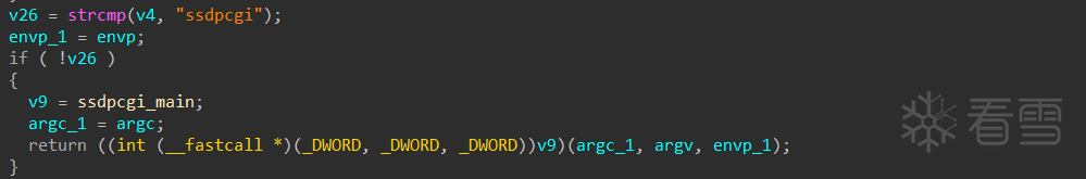 根据漏洞披露的信息可知和ssdpcgi_main函数以及cgibin文件有关,将cgibin文件拿到IDA中分析并直接搜索ssdpcgi_main函数,调用该函数的代码为: