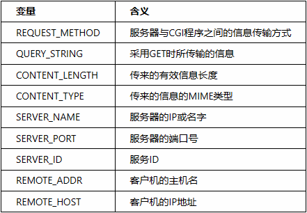 CGI程序继承了系统的环境变量。CGI环境变量在CGI程序启动时初始化,在CGI程序结束时销毁。当CGI程序被HTTP服务器调用时,它的环境变量就会增加一些和HTTP服务相关的环境变量。下面是一些常见的和HTTP相关的环境变量(CGI程序使用getenv()