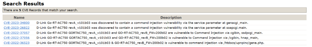 前面的复现都是以CVE编号为主的复现,这次换个方式,以路由器型号为单位进行复现。本次复现的命令注入漏洞都是D-Link Go-RT-AC750中存在的漏洞,目前一共有五个: