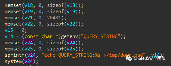 程序通过获取请求参数将参数传递给变量v14,之后再通过sprintf将参数格式化拼接在变量v24后 未被过滤的v24传入system函数,进而导致任意命令执行