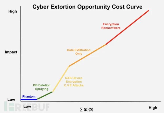 该图表显示,复杂性和自动化程度最低的勒索攻击成本最低,但对受害者造成的影响也最小,平均单次攻击的赎金要求通常在几百美元到数千美元之间,攻击者通常希望以”走量“的方式获得不俗的赎金收入;而更复杂、更耗时、影响更大的攻击单次会产生更高的赎金要求,通常为数百万美元。
