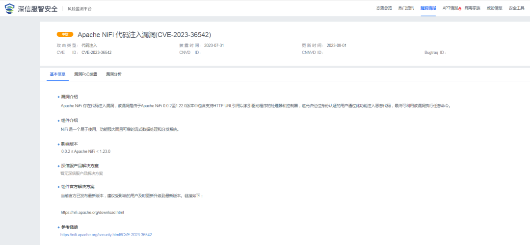 2023年8月2日,深信服安全团队监测到一则Apache NiFi组件存在代码注入漏洞的信息,漏洞编号:CVE-2023-36542,漏洞威胁等级:中危。