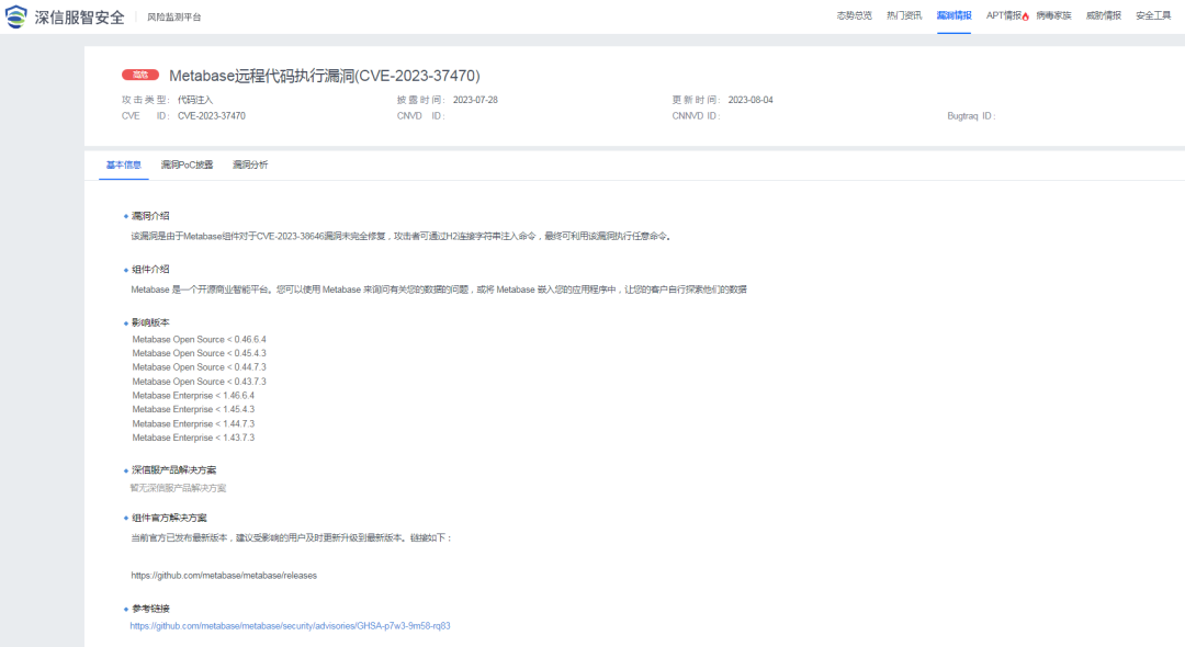 2023年8月4日,深信服安全团队监测到一则Metabase组件存在远程代码执行漏洞的信息,漏洞编号:CVE-2023-37470,漏洞威胁等级:严重。