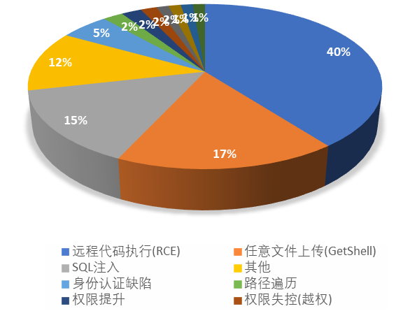 本合集对2023攻防演练可能被利用的227个漏洞进行了分类统计,高频漏洞为远程代码/命令执行漏洞、文件上传漏洞和SQL注入漏洞,其中具体分布如下: