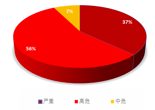 按照漏洞危害等级统计,227个漏洞中有84个被标记为严重,126个被标记为高危,17个被标记为中危,其分布情况如下: