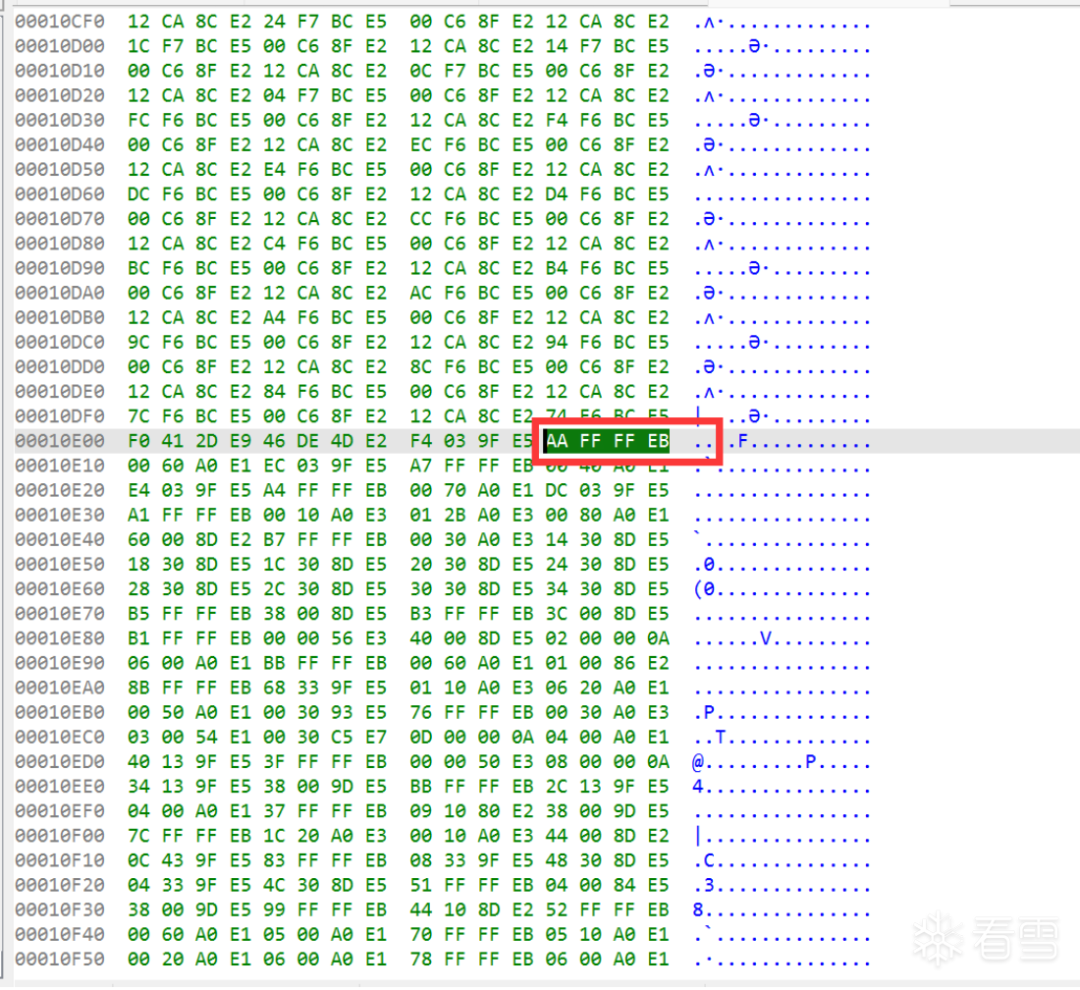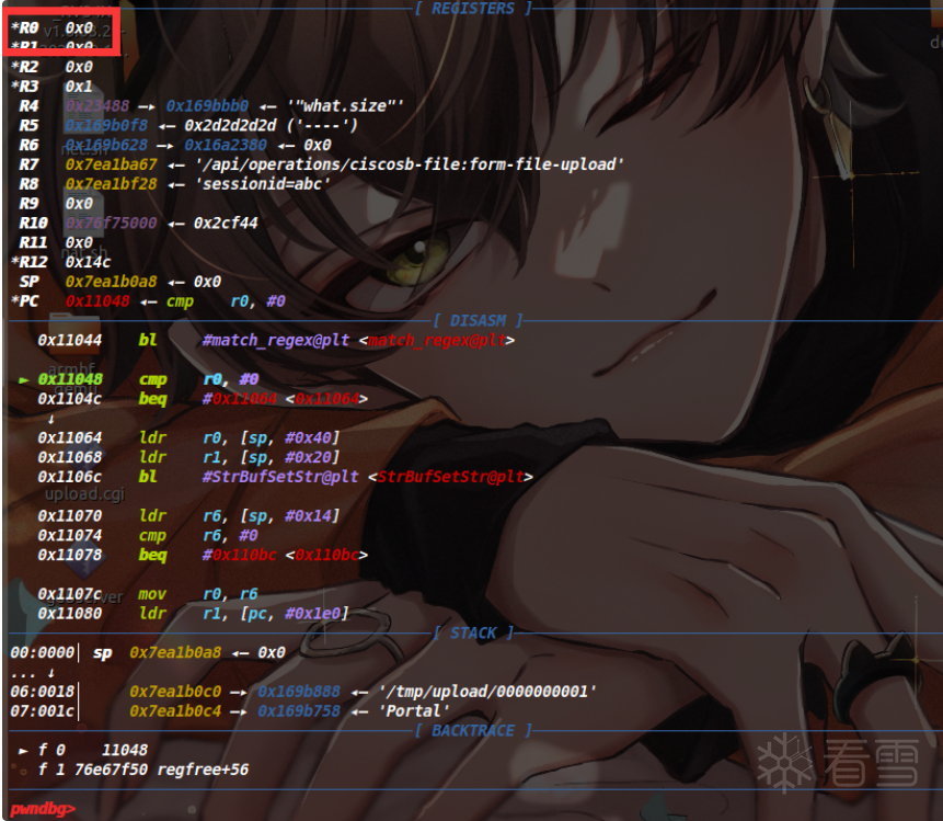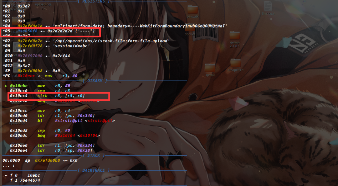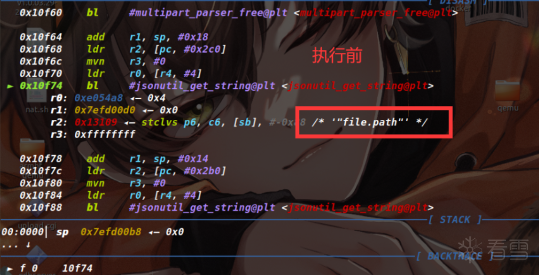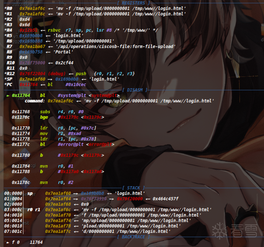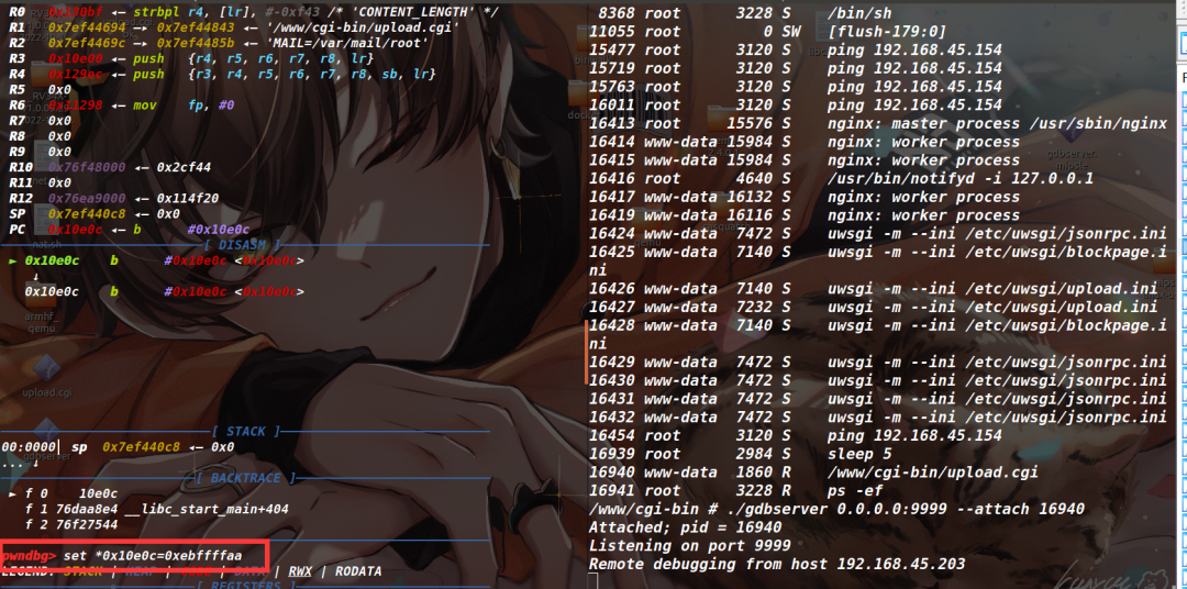 因为我们通过patch让进程陷入了死循环,所以要用set命令给改回正常的指令,查看之前备份的upload.cgi文件,发现这里原本机器码为AA FF FF EB,因此执行set *0x10e0c=0xebffffaa命令(因为小端序,这里是反着输入的)。