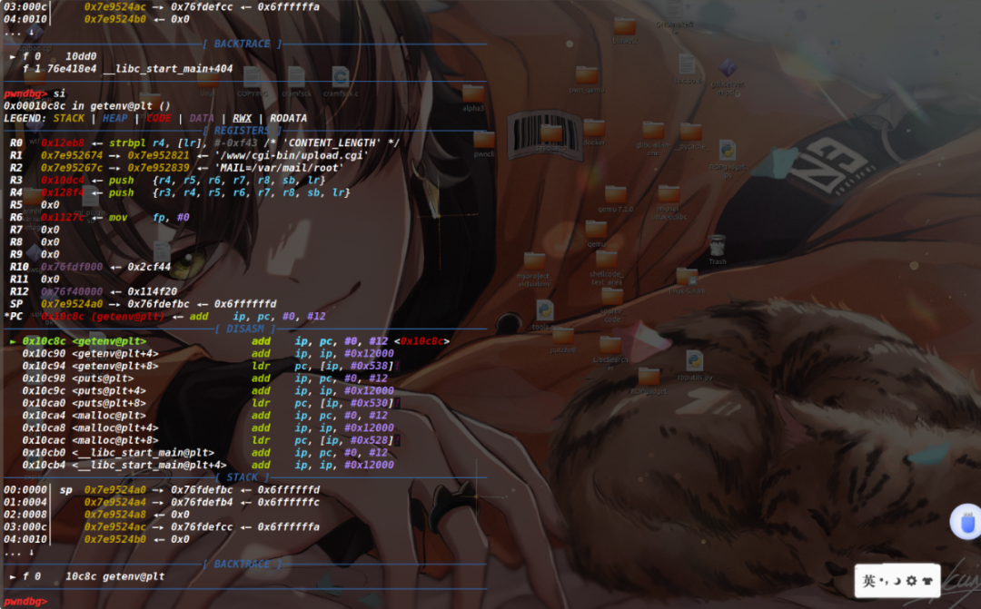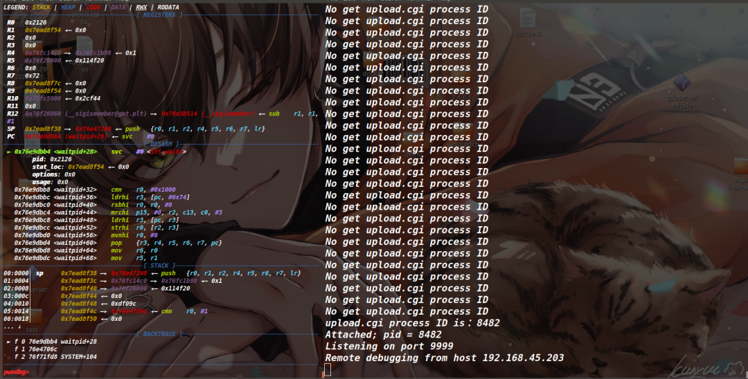 使用上面的爆破脚本开始运行,然后gdb执行target remote 192.168.45.66:9999,接着发送报文,此时会触发upload.cgi进程,如果运气好的话爆破脚本此时正好会捕捉到进程号,开启调试。