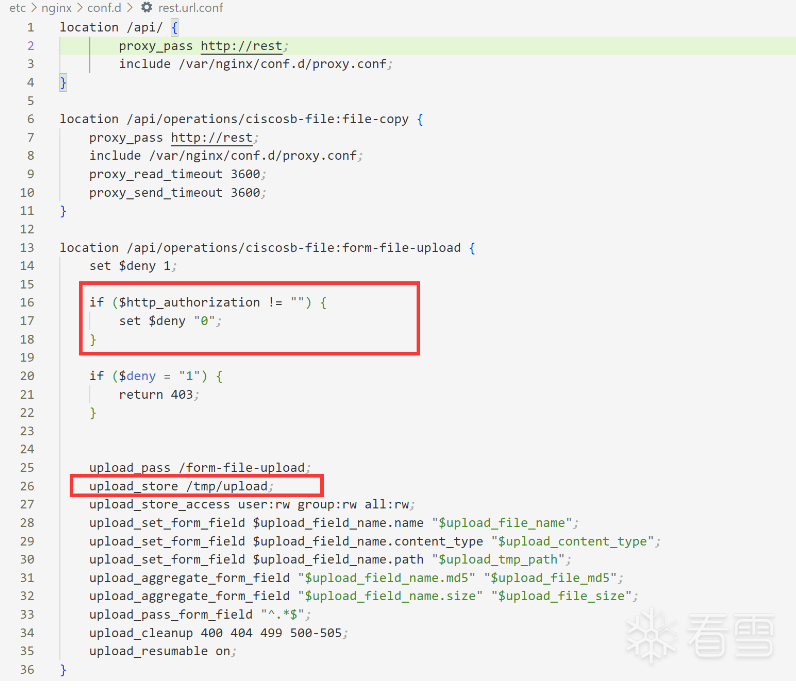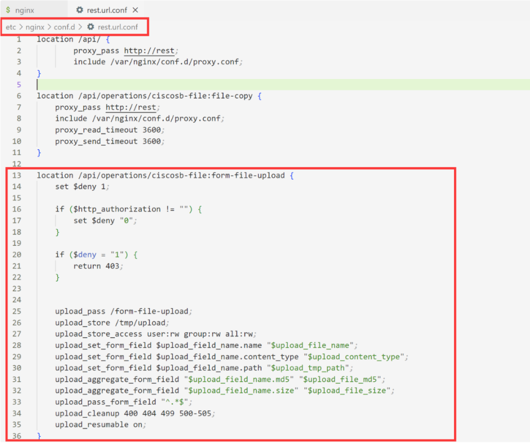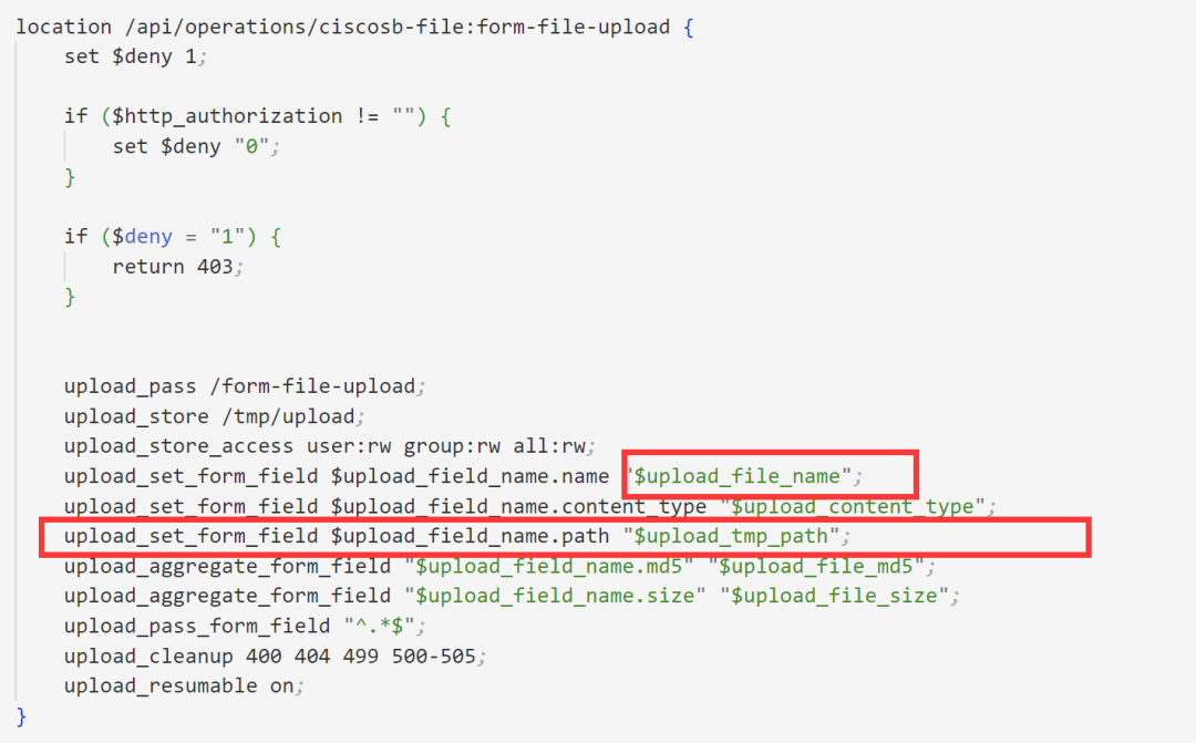 首先是location /api/operations/ciscosb-file:form-file-upload,这个location块是Nginx配置文件中用于匹配URL路径的指令,就比如访问192.168.0.1:/api/operations/ciscosb-file:form-file-upload就可以执行到下面的代码。