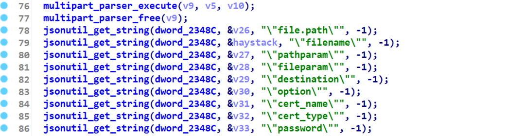 然后执行到jsonutil_get_string函数时,可以把file.pathpathparam这种字段的值给解析出来,以jsonutil_get_string(dword_2348C, &v26, “\”file.path\””, -1);为例,下面放出该函数执行前和执行后的情况。