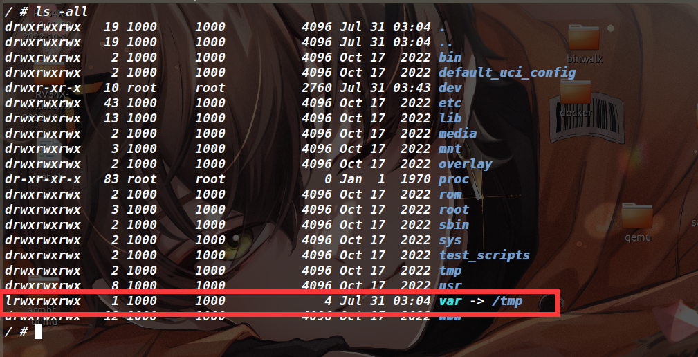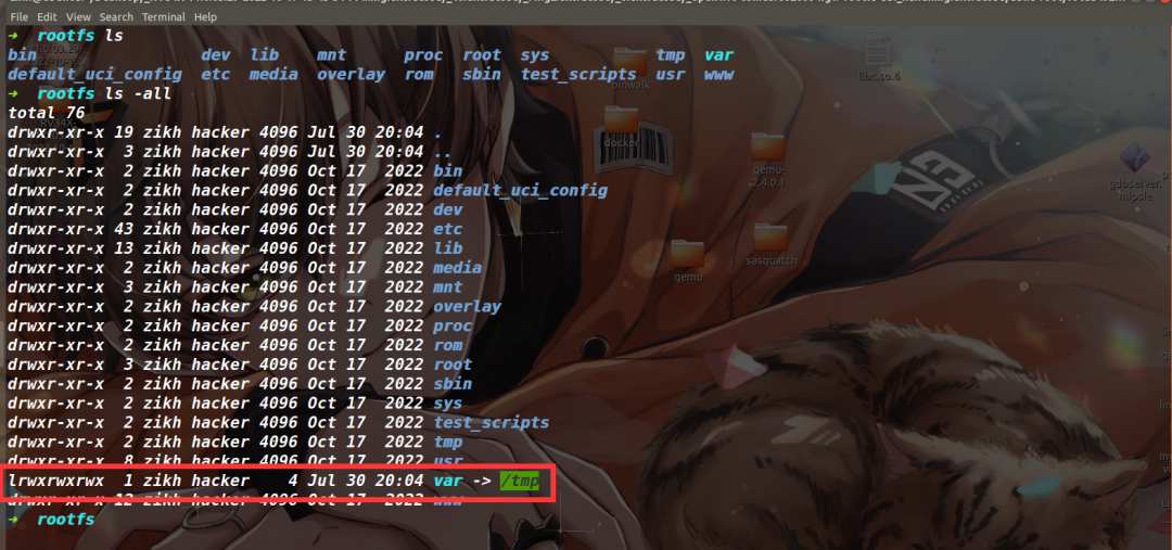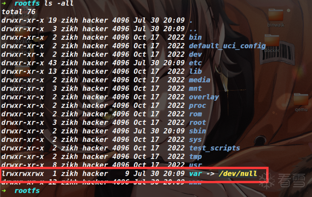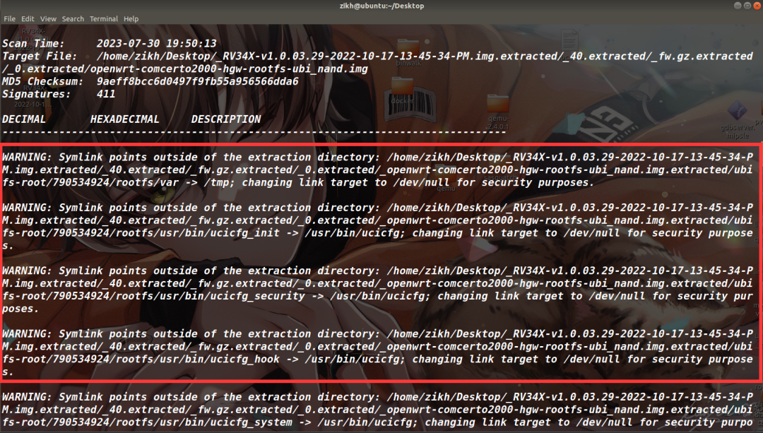 但是还没完,binwalk还有warning(如下图),说是原本文件中存在的软链接指向了提取目录之外,就比如当前的var目录,它指向的是我本机的/tmp目录,为了安全考虑binwalk将这种软链接都置成了/dev/null。这里放任不管的话,之后的仿真会失败,比如路由器的某个服务需要去访问var目录下的文件,但它如果是被置成/dev/null的话,目录自然是缺失的。其实这个var -> /tmp的本意是指向提取出来文件系统的/tmp,并非是我本机的/tmp,因此只要我能保留这个软链接,到时候用chroot创建一个隔离的文件系统就一切正常了。
