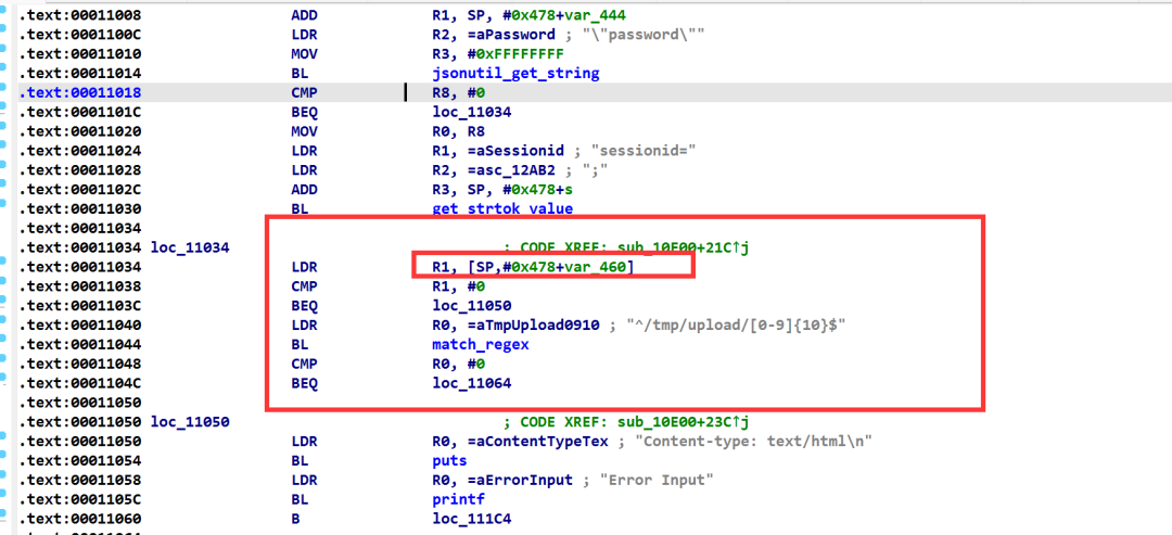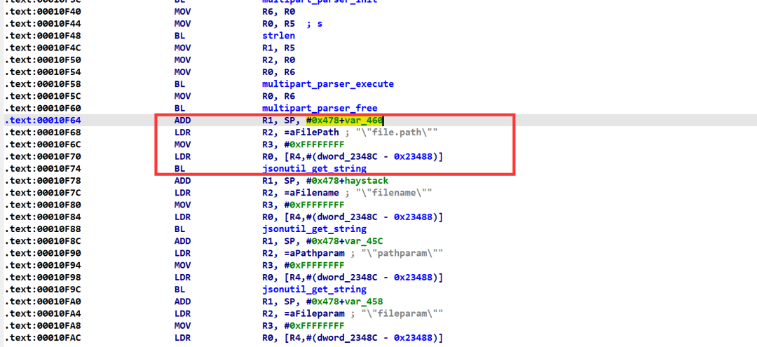 这个函数在对login.html字符串进行匹配,但在发送的报文中我们将file.path和fileparam都设置为了login.html,是匹配的哪个字段的值呢?我们通过IDA的汇编部分来寻找一下,通过下图可以看出来,R1的值是从SP,#0x478+var_460位置拿到的,其实也就是SP+0x18的位置。