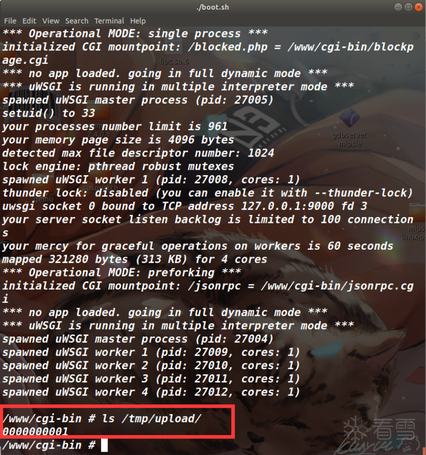 要想成功的话,就得让file.path为/tmp/upload/xxx,正常的序号应该是下面这样,/tmp/upload/0000000001,只需要把upload.cgi进程卡住,查看一下/tmp/upload目录下的文件即可(如下)。