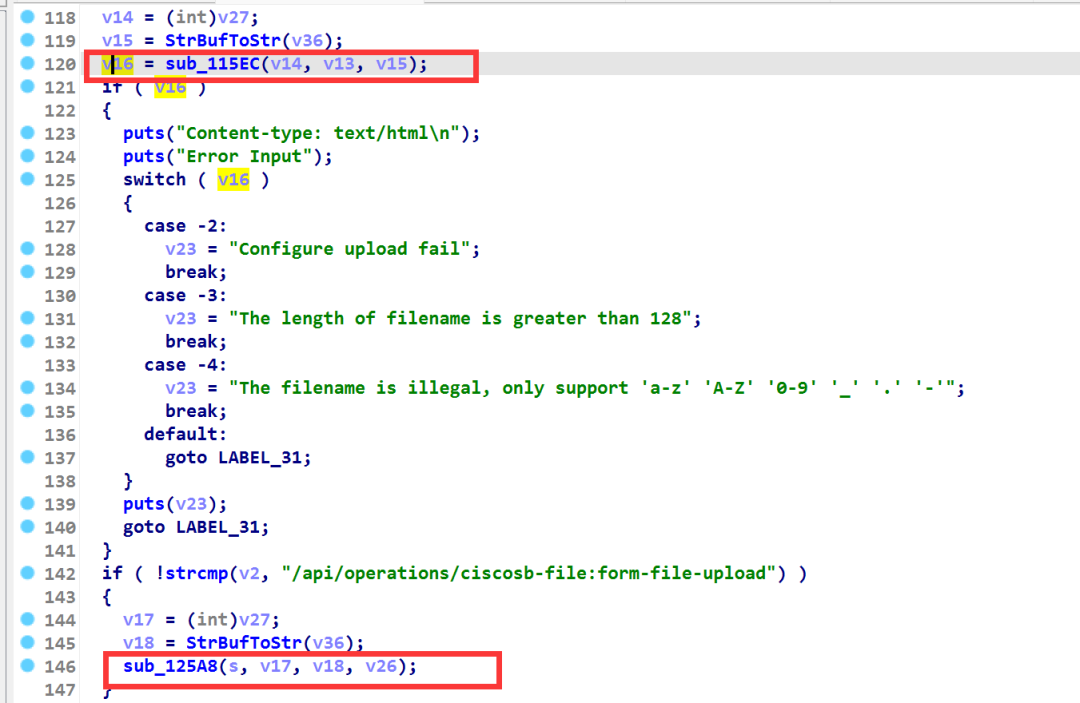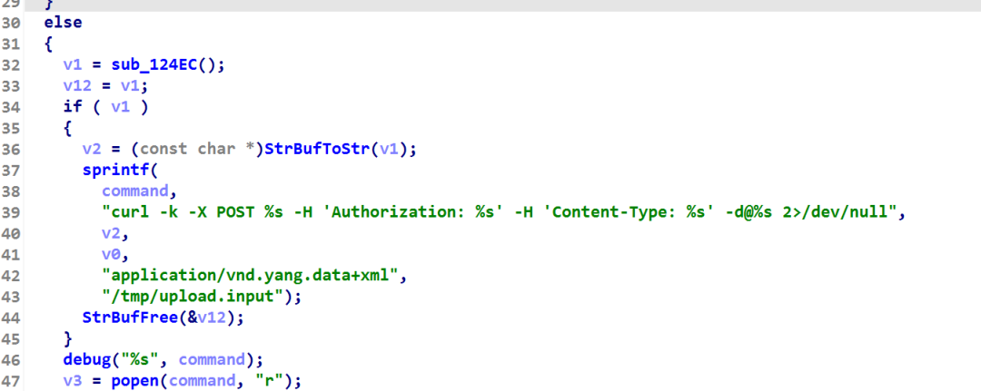 根本原因是身份认证位于了漏洞发生处之后,只要system的命令执行成功,sub_115EC函数的返回值就为0,又因为我们访问的URL为/api/operations/ciscosb-file:form-file-upload,所以会进入下面的if执行sub_125A8函数(如下图)。
