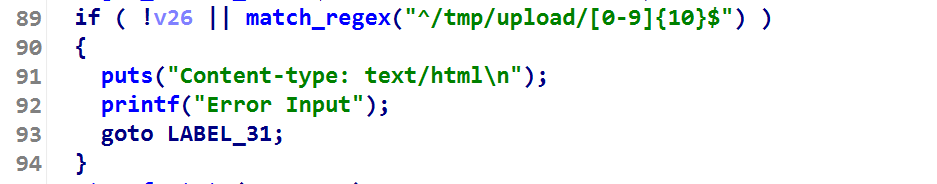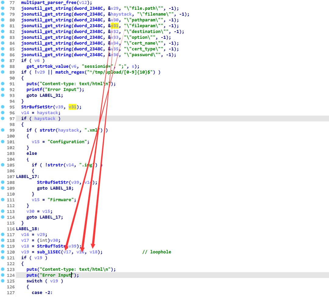然后我们往上寻找,发现在解析file.path字段时,出现了这个地址。因此得出结论是match_regex会对file.path的值进行正则匹配,函数返回值为1,于是执行流就走偏了(做一些退出的工作,就结束了,在结束前会调用system函数将/tmp/upload下的所有文件删掉)。