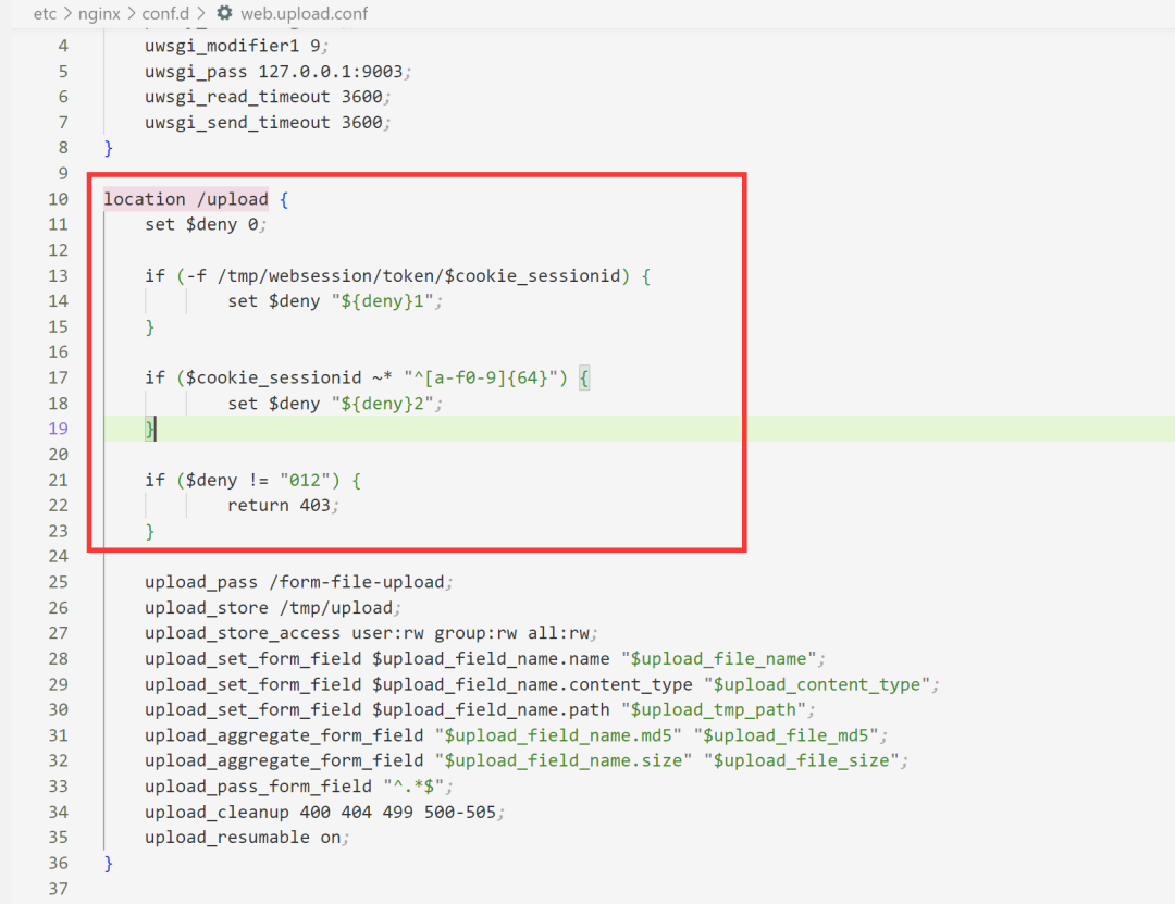 这地方的代码就很奇怪,因为这里只需要控制一下Authorization就可以将文件上传到/tmp/upload目录,也没有做sessionid的判断。可以看一下location /upload的代码(如下图),这里做了/tmp/websession/token/$cookie_sessionid文件是否存在的判断以及正则匹配的检查防止目录穿越。