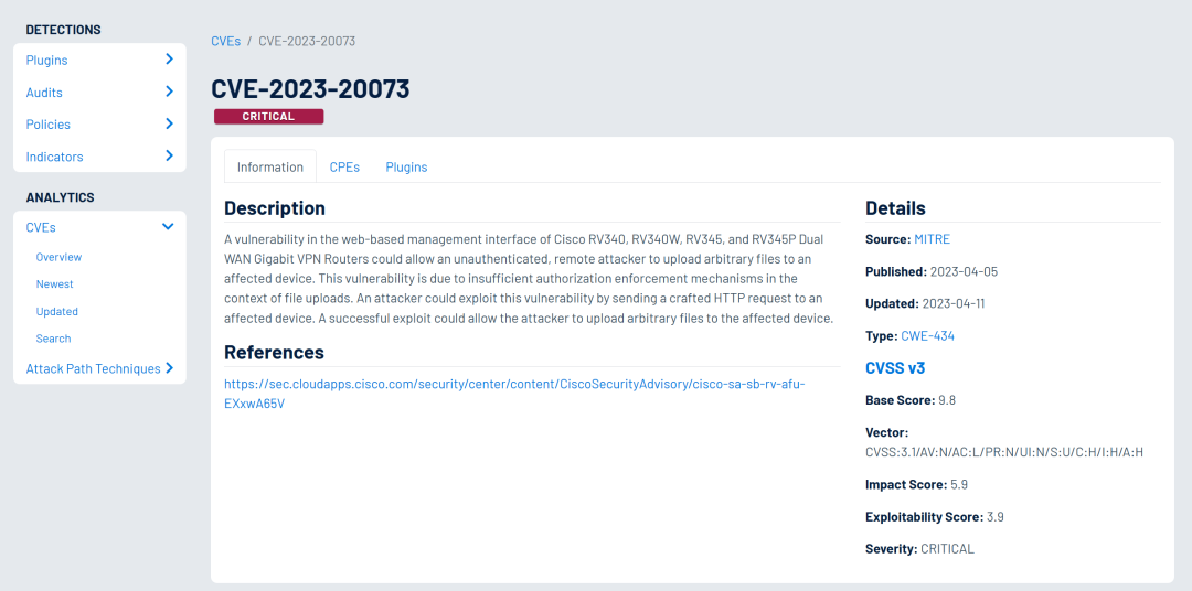 Cisco RV340,RV340W,RV345和RV345P四款型号的路由器中最新固件均存在一个未授权任意文件上传漏洞 (且目前尚未修复),攻击者可以在未授权的情况下将文件上传到/tmp/upload目录中,然后利用upload.cgi程序中存在的漏洞,最终造成存储型XSS攻击。