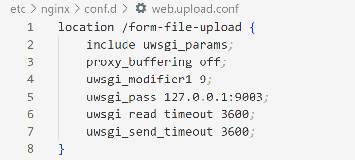 说完此处的文件上传,再来看一下upload_pass /form-file-upload,它会跳转到location /form-file-upload这里的代码来执行,这里有一个uwsgi_pass 127.0.0.1:9003,它会把请求转发给uwsgi给处理。