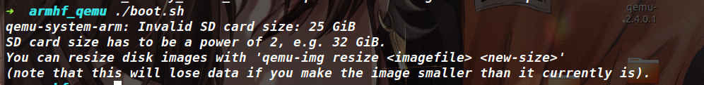 如果执行启动脚本的话,应该会报如下错误,这里说的是SD card size应该是2的幂,应该改成32GB。