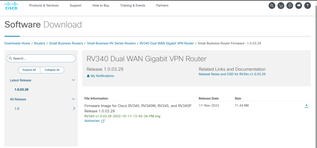 首先在思科官网(https://software.cisco.com/download/home/286287791/type/282465789/release/1.0.03.29)中下载最新的RV340固件。