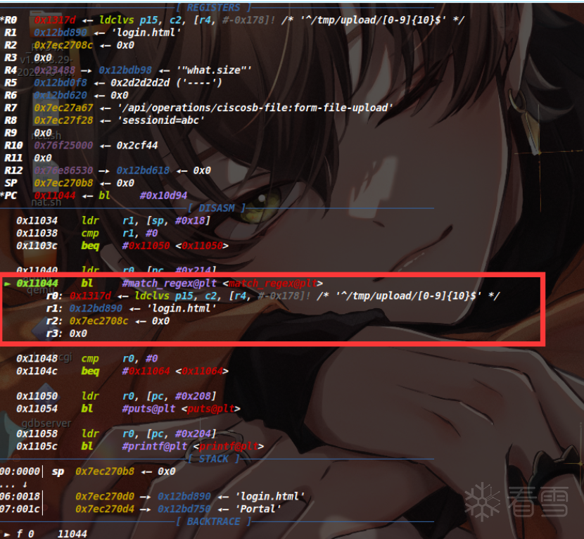 至此就可以正常来调试upload.cgi进程(如下)。