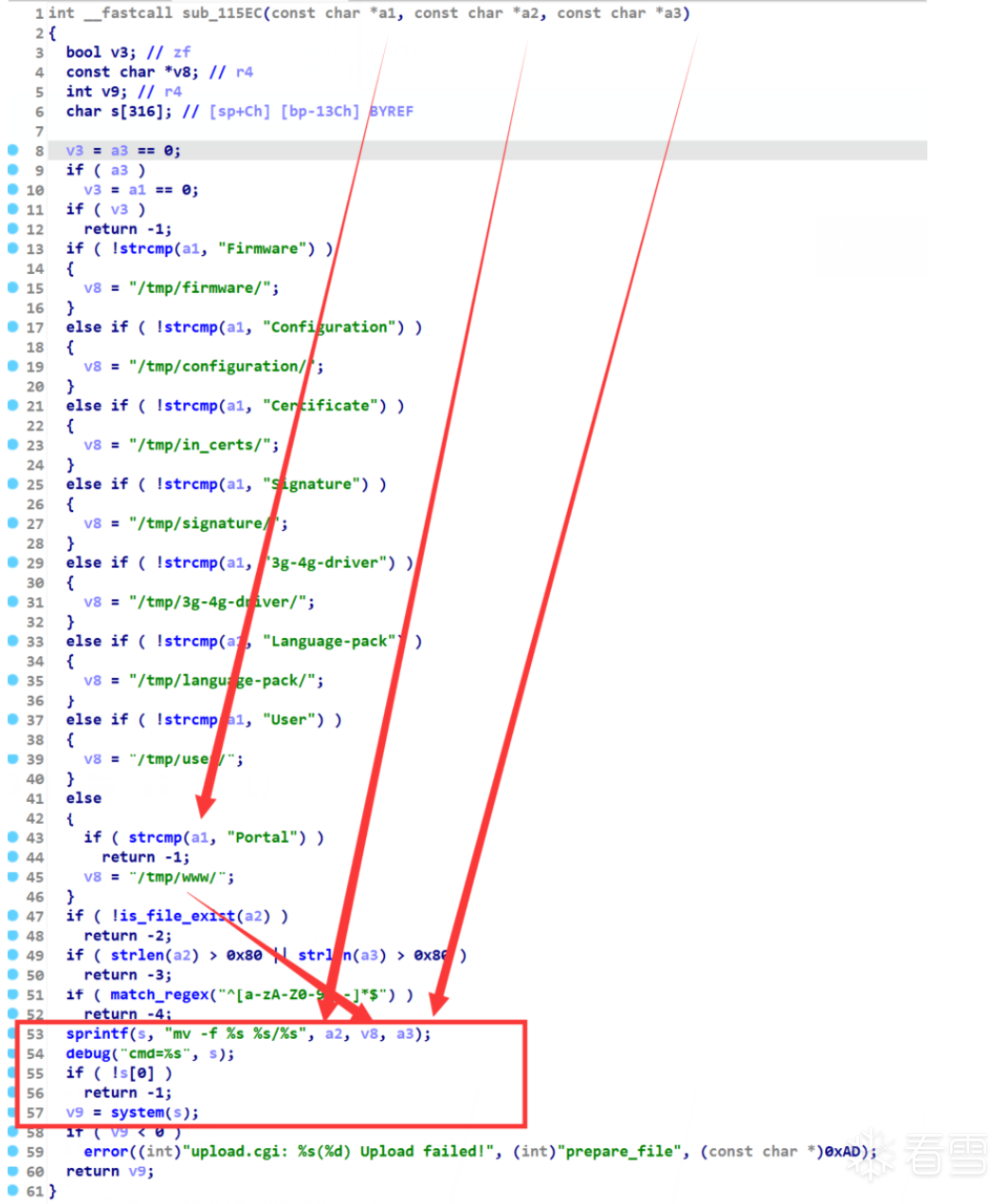 最终system会执行mv -f a2 v8/a3,而这三个变量都可以控制,/www/login.html软链接到了/tmp/www/login.html这个文件上,因此如果我们能把a2控制为刚上传的文件路径,v8控制为/tmp/www,a3控制为login.html就能执行mv -f /tmp/upload/xxx /www/login.html从而完成对路由器登录界面的篡改。要将v8控制为/tmp/www则要设置a1的值为Portal。