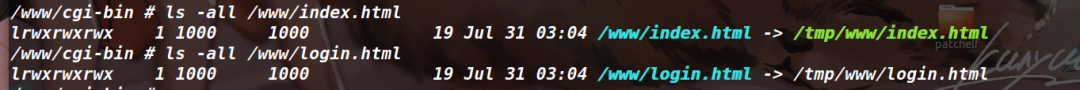 就算上面两个条件都满足了,也只是可以将上传的文件移动到/tmp/www目录下,如果这下面没放什么东西的话,也不会有什么危害。但问题就在于/www/login.html和index.html两个文件软链接到了/tmp/www/login.html和/tmp/www/index.html上(如下图),只要覆盖掉/tmp/www/login.html或者/tmp/www/index.html就可以篡改掉登录首页面,从而完成了最终存储型XSS攻击。