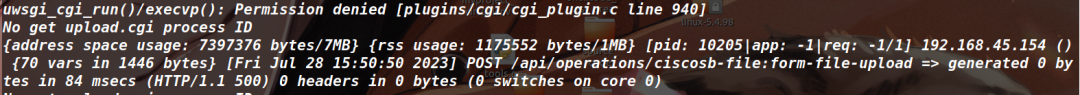nginx服务本身会报一个Permission denied的错误,这是因为传进来的upload.cgi属于root用户,但是启动upload.cgi进程的用户是www-data(ps -ef可以查看),它的uid是33,权限不够。